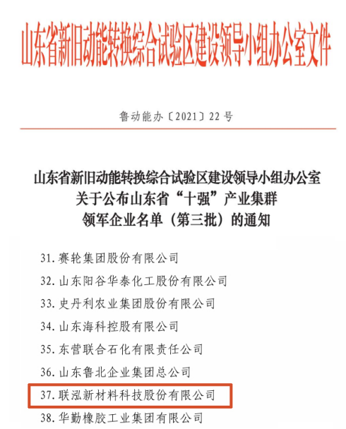 近日,《山東省新舊動(dòng)能轉(zhuǎn)換綜合試驗(yàn)區(qū)建設(shè)領(lǐng)導(dǎo)小組辦公室關(guān)于公布山東省“十強(qiáng)”產(chǎn)業(yè)集群領(lǐng)軍企業(yè)名單(第三批)的通知》(魯動(dòng)能辦[2021]22號(hào))發(fā)布,聯(lián)泓新科入庫(kù)”十強(qiáng)“產(chǎn)業(yè)集群領(lǐng)軍企業(yè)。按照山東省《“十強(qiáng)”產(chǎn)業(yè)集群領(lǐng)軍企業(yè)培育支持辦法》有關(guān)要求,對(duì)于入庫(kù)企業(yè),山東省各級(jí)政府將重點(diǎn)培育支持。