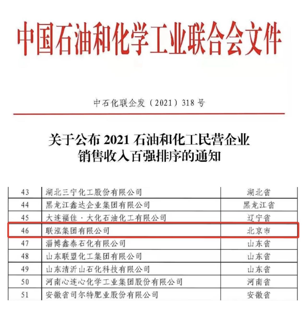 12月28日,中國石油和化學工業(yè)聯(lián)合會發(fā)布了2021中國石油和化工民營企業(yè)銷售收入百強榜單。聯(lián)泓集團有限公司位列第46位。