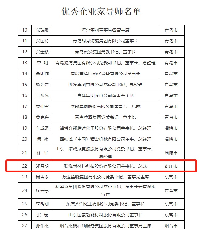 5月16日,山東省工信廳發(fā)布《關(guān)于建立青年企業(yè)家培養(yǎng)導師制的通知》。從今年起,山東將建立青年企業(yè)家培養(yǎng)導師制,邀請2021年山東省委、省政府表彰的部分優(yōu)秀企業(yè)家擔任導師,依托導師所在企業(yè)建立“青年企業(yè)家培育中心”,發(fā)揮優(yōu)秀企業(yè)家傳幫帶和產(chǎn)業(yè)引領(lǐng)作用,培養(yǎng)青年企業(yè)家。聯(lián)泓新科董事長鄭月明受邀擔任“優(yōu)秀企業(yè)家導師”。