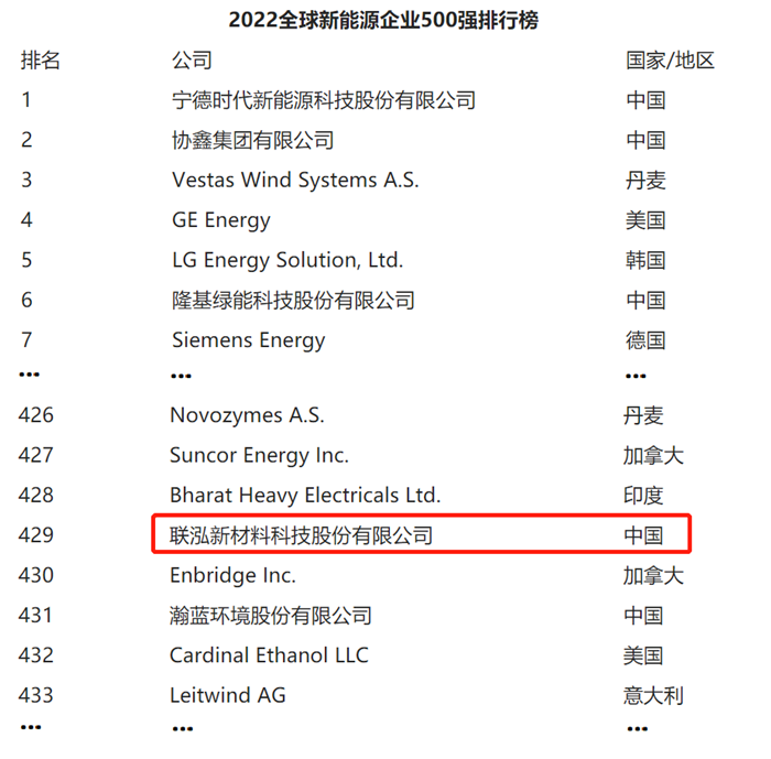 近日,“2022全球新能源企業(yè)500強(qiáng)榜單”重磅發(fā)布,寧德時(shí)代、協(xié)鑫集團(tuán)、隆基綠能、中國(guó)能建等4家中國(guó)企業(yè)躋身榜單前十,聯(lián)泓新材料科技股份有限公司(簡(jiǎn)稱:聯(lián)泓新科)憑借在光伏材料、鋰電材料等新能源領(lǐng)域的亮眼成績(jī)榮耀上榜。