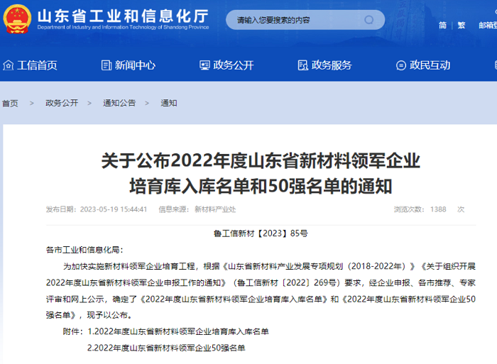 新材料是山東省重點(diǎn)培育的“十強(qiáng)”產(chǎn)業(yè)之一。為推動(dòng)新材料產(chǎn)業(yè)高質(zhì)量發(fā)展,山東省工信廳組織實(shí)施新材料領(lǐng)軍企業(yè)培育工程,通過(guò)企業(yè)申報(bào)、各市推薦、專(zhuān)家評(píng)審和網(wǎng)上公示等程序,對(duì)新材料企業(yè)產(chǎn)品布局、創(chuàng)新能力、銷(xiāo)售收入、品牌影響力、數(shù)字化水平、企業(yè)信譽(yù)等方面工作進(jìn)行綜合考量,評(píng)選出“山東省新材料領(lǐng)軍企業(yè)50強(qiáng)”。對(duì)于新材料領(lǐng)軍企業(yè),山東省將加大培育力度,給予獎(jiǎng)勵(lì)扶持,推動(dòng)企業(yè)做大做強(qiáng)。