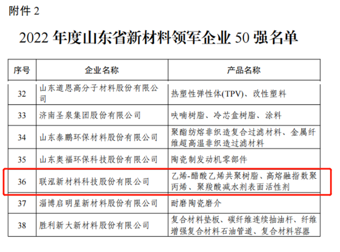 5月17日,山東省工業(yè)和信息化廳公布《2022年度山東省新材料領(lǐng)軍企業(yè)培育庫(kù)入庫(kù)名單和50強(qiáng)名單》。聯(lián)泓新材料再次上榜“山東省新材料領(lǐng)軍企業(yè)50強(qiáng)”。