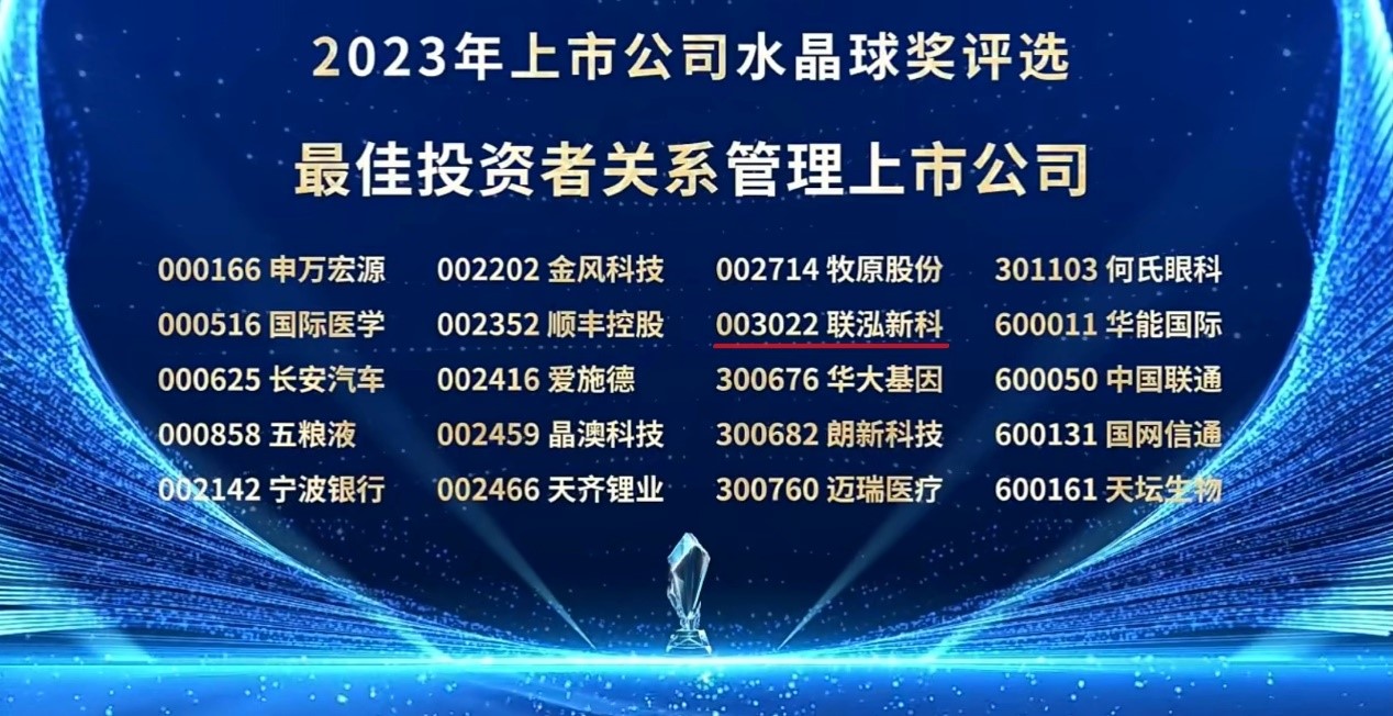 2023年12月29日,《證券市場周刊》2023年上市公司水晶球獎評選榜單揭曉,聯(lián)泓新科董事長、總裁鄭月明獲評“2023年度最佳總裁/總經(jīng)理/CEO”,聯(lián)泓新科獲評“2023年最佳投資者關系管理上市公司”。