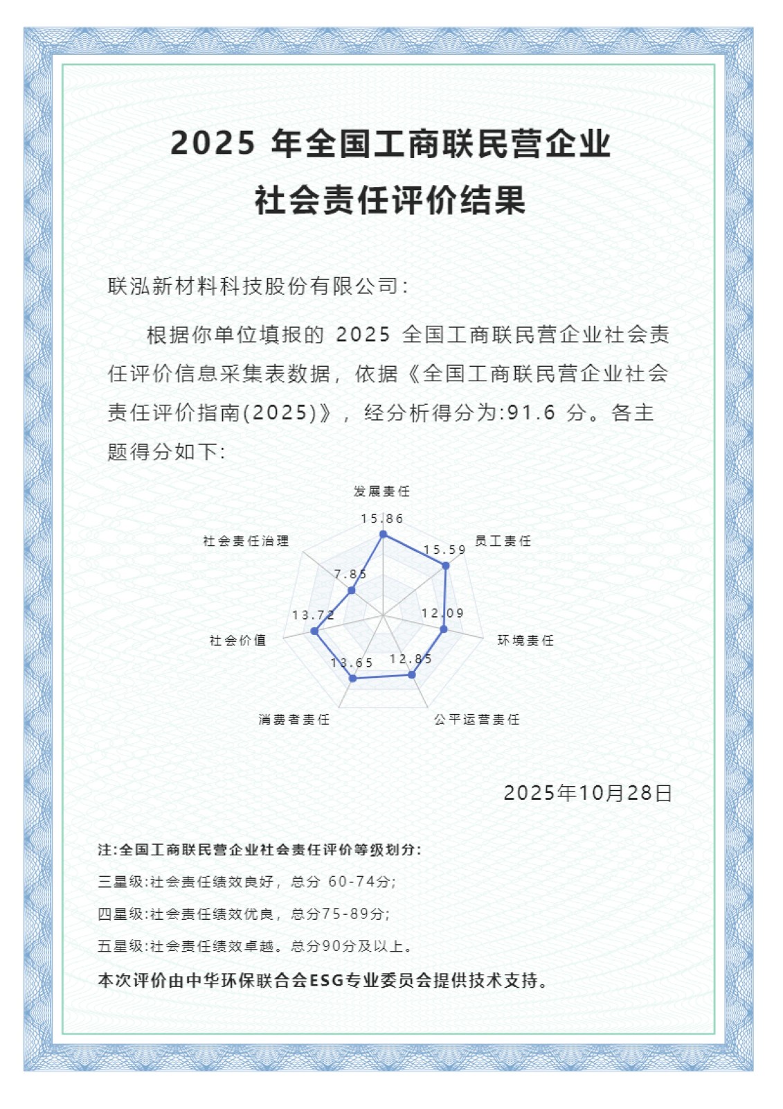 聯(lián)泓新科獲全國工商聯(lián)民營企業(yè)社會(huì)責(zé)任評(píng)價(jià)最高等級(jí)“五星級(jí)”